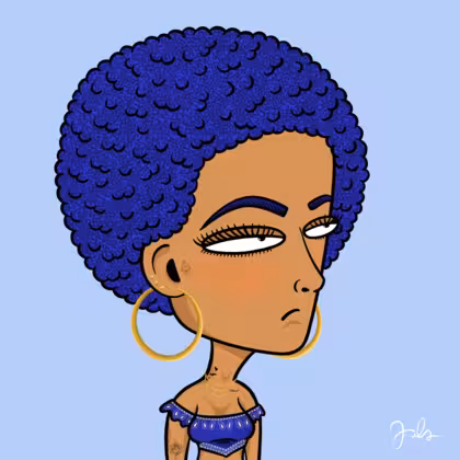 Collection Depressed Citizens Artist Juls Description ART. No team, no project, no future. Depressed Citizens is an urban & existential Art expression on Ordinals. In a parallel universe, "THEI" control us. DC unites against toxic society, encouraging critical thinking. 100% hand made collection that took Juls more than 6 months of daily work. Name Citizen#2586 Origin Hispanic Gender Woman Necklace Gold layered necklace Hat No Hat Mustache Beard No beard Glasses No Glasses Earrings Ball earrings trio Hair Style Afro Clothes Blue bandana crop top Tattoo Rose tattoo Star Background Without stars