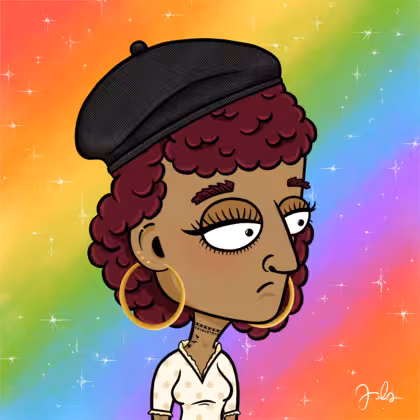Collection Depressed Citizens Artist Juls Description ART. No team, no project, no future. Depressed Citizens is an urban & existential Art expression on Ordinals. In a parallel universe, "THEI" control us. DC unites against toxic society, encouraging critical thinking. 100% hand made collection that took Juls more than 6 months of daily work. Name Citizen#1208 Origin LGBT-Q+ Gender Woman Necklace Choker Hat Black beret Mustache Beard No beard Glasses No Glasses Earrings Rook hoop Hair Style Curly Clothes Polka dot shirt Tattoo Rose tattoo Star Background With stars
