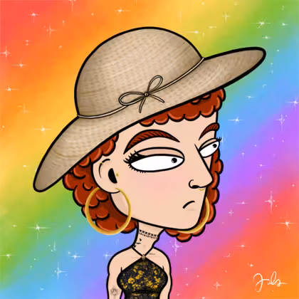 Collection Depressed Citizens Artist Juls Description ART. No team, no project, no future. Depressed Citizens is an urban & existential Art expression on Ordinals. In a parallel universe, "THEI" control us. DC unites against toxic society, encouraging critical thinking. 100% hand made collection that took Juls more than 6 months of daily work. Name Citizen#1055 Origin LGBT-Q+ Gender Trans Necklace Choker Hat Floppy sun hat Mustache Beard No beard Glasses No Glasses Earrings Tragus star earring Hair Style Curly Clothes Golden black halterneck top Tattoo Rose tattoo Star Background With stars