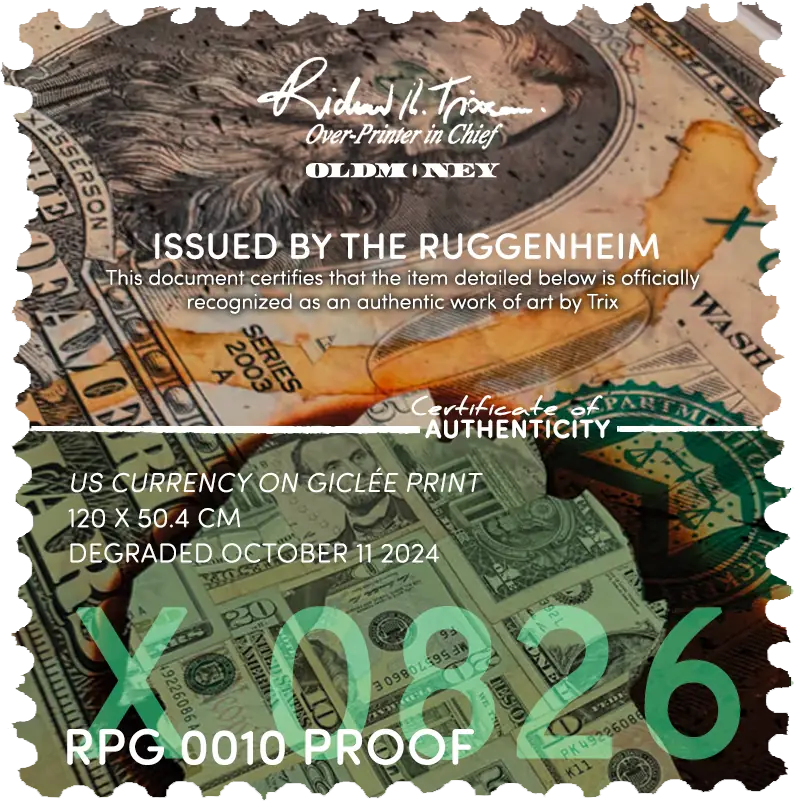 RPG 0010 PROOF ISSUED BY THE RUGGENHEIM | THE ITEM DETAILED IS OFFICIALLY RECOGNIZED AS AN AUTHENTIC WORK OF ART BY TRIX: US CURRENCY ON GICLÉE PRINT • POINT TWO • SERIAL X 0826 1757 X • 120 X 50.4 CM • DEGRADED 11 OCTOBER 2024